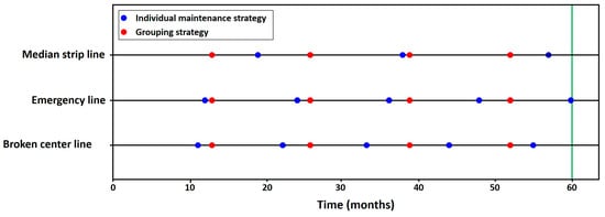 In Table 6, the average reliability for each cluster under the three considered different maintenance strategies is introduced. If no maintenance action is performed, the average reliability does not exceed 0.24%, which is perfectly understandable since the road markings performance decrease to zero and then stay null up to the end of the time horizon. We can notice that, as previously introduced, the average reliability for the considered two maintenance strategies is quite close and generally better for the grouped approach (even if we also noticed that the variance is generally better for the individual approach). However, in terms of economic perspectives, the grouped maintenance strategy systematically provides an interesting economic benefit. In this case, the grouped maintenance strategy is more interesting. Moreover, we noticed that the availability of infrastructures is necessarily better with grouped actions than with individual strategies, which is a not-negligible advantage.
