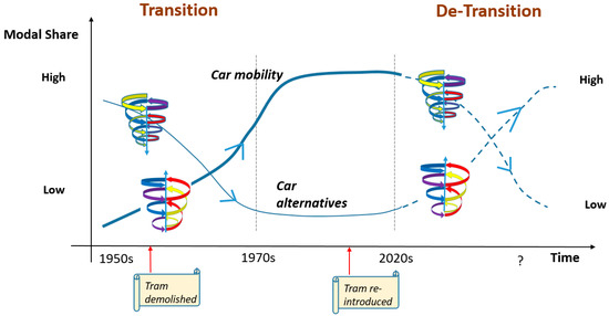 Ironically, before the car mobility transition (in the 1950s and 1960s in Western countries, and in the 1990s in Eastern Europe), most cities were accessible by walking, cycling, public transport, and by the few cars there were. For example, transition scholars have reconstructed the historical transformation of mobility in the city of Maastricht in the period of 1950–1980 from cycling as the most popular mode of traveling in the 1950s to car driving by the end of the 1970s [12]. In many respects, cities are currently seeking to follow a reversed pathway, which we here label as “de-transition”.