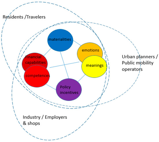 These interdependent elements constitute a practice when being reproduced or transformed. A practice is reproduced when elements and their links are successfully repeated in similar performances. A transformation occurs when new elements or the connections between them emerge, established ones shift, or disappear. In turn, a practice develops, changes, or dissolves. Thus, via reconfigurations between and disruptions in elements, transitions in practices emerge. In addition, because practices are also connected to other practices, it is important to understand not only the constitutive elements of a practice, but also how a specific practice relates to others [30]. Multiple practices overlap, form hierarchies, or are combined into other practices. In addition to established practices (such as car mobility), there may be emerging practices (such as e-steps or micro-mobility). This concerns not only other mobility practices, but also neighbouring practices such as going to school, leisure, or shopping (see Figure 3). In these so-called bundles, practices are co-dependent, co-constitutive, and co-existing. Therefore, an alteration in one practice might have severe consequences for other practices [32,33]. All in all, an interplay between the circumstances, context, and bundles of practices takes place in everyday life, shaping the conditions and possibilities for change to occur [30,33].