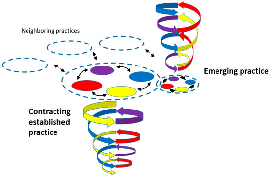 Interplays between existing, emerging, and neighbouring practices. (As explained in Section 2.3, the coloured arrows refer to changing elements, with blue accounting for materialities, red for competences, yellow for social meanings, and purple for policy incentives).