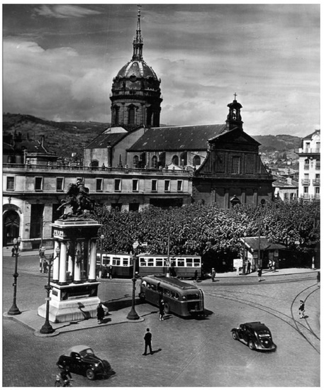 Jaude Square in the early 1950s, with a mix of walking, cycling, car, bus, and tram transportation (Copyright, 2022, La Montagne) [41].