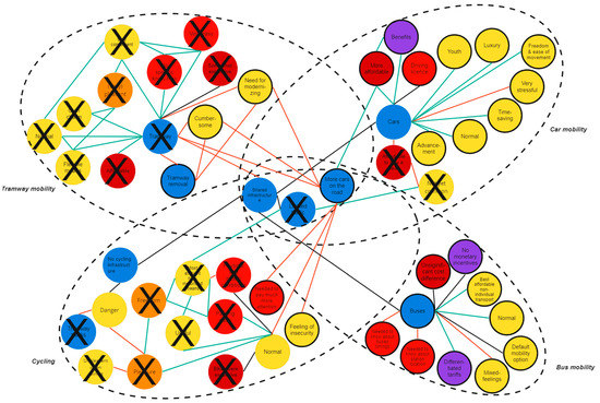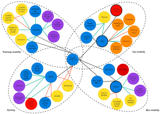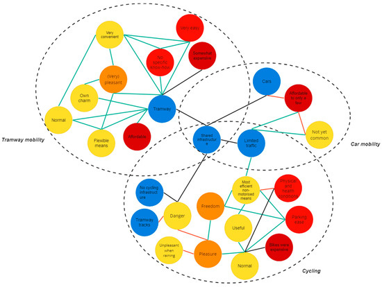 Cycling, walking, car, and tramway mobility in metropolitan Clermont-Ferrand in the early 1950s. (The coloured circles represent the highlighted terms in the main text, with blue accounting for materialities, red for competences, dark red for financial capabilities, yellow for social meanings, and orange for emotions). Elements are linked to one another through lines indicating a positive causal effect (green lines), a negative effect (red lines), or a neutral relationship (black lines).