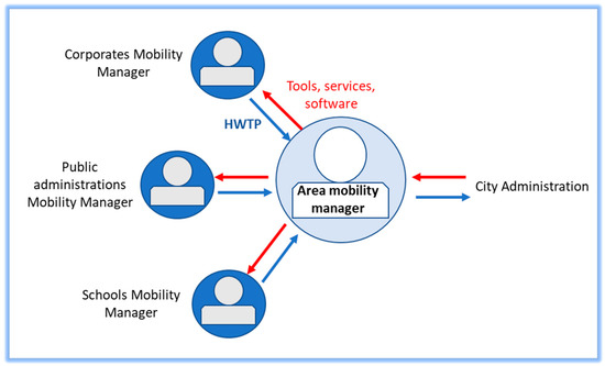 The MM is responsible for preparing and revising the company center’s “Home-to-Work Travel Plan” (HWTP) that sets the framework for the organization of all the employees’ home-to-work journeys by promoting the use of carpooling, car sharing, and collective cabs, as well as public transport, cycling, and walking. The aim is to reduce the use of private transport by giving employees useful information and creating a culture of sustainable mobility in coordination with the high-level mobility manager (so-called “Area MM”) of local administration, who collects all the HWTPs (Figure 1). He can help corporate MMs to prepare their HWTP by providing support tools, and he can review the public transport supply. He may also provide subsidies for local public transport (LPT) annual passes.