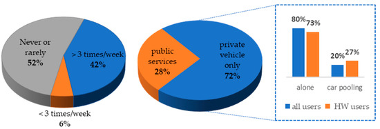 The survey answers showed an equal distribution between people who use the company service at least once a week and those who do not at all. Among the former, 42% use the service 3–4 days a week, while 6% take the shuttles no more than 1–2 times (Figure 4). It is worth noting that a significant portion (28%) of the commuters who use the company service also use public transportation as an alternative. Furthermore, the remaining 72%, while exclusively using a private vehicle as an alternative, share the journeys by car with a percentage of 22%.
