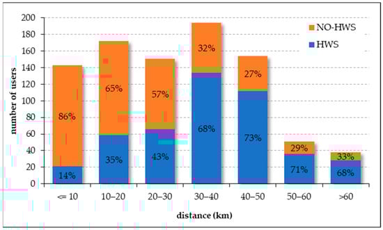 We verified that the home-to-work distances reported in the questionnaire were often incorrect due to a tricky selection tool implemented in the online survey. For this reason, as anticipated in Section 2, it was necessary to reconstruct individual home-to-work paths. The related average traveled distance is 35 km (σ = 15 km) for service users. On the other hand, people not using the service usually travel shorter distances, on average 29 km (σ = 16 km). Note the high standard deviation values σ associated with the above travel distances.