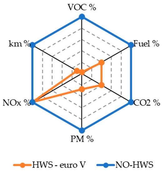 The % difference in km, emissions, and consumption of HWS scenario compared to NO-HWS scenario.