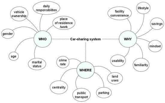 It should be noted that the process of interviews was long and exhausting for the interviewers, but it also offered a unique opportunity for understanding people’s thoughts, reactions, and stated opinion. It also offered some outcomes that cannot be grouped or classified, unveiling the power of qualitative methods [55]. After the end of the interview process, some interviewees started asking questions about carsharing (how it works, cost, etc.) showing interest in it. Strikingly, it is assumed that the process of the interview, in some cases, changed the degree of familiarity with carsharing. The line-by-line data analysis process was also long, but it provided valuable results as it enabled the creation of codes and concepts that were used and validated throughout the rest of the data analysis (codes creation is also appraised in [56]). The results (17 parameters) are grouped in three categories (Figure 1), which represent the main questions of this research: Who, Where, and Why.