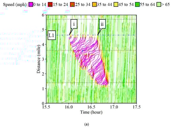 Figure 2a shows the space–time diagram of all CV trajectories along a six-mile section of the Interstate 465 (I-465) Inner Loop (IL) in Indiana for a two-hour period between 3:30 PM and 5:30 PM on Sunday, 16 January 2022. The individual waypoints for the respective trajectories are connected to each other and color-coded by the speed bins. The horizontal axis represents the time and the vertical axis shows the distance. The horizontal black dotted lines denote the locations of the interstate exists. Waypoints registering a speed below 15 mph are assumed to be in the congested region highlighted in pink. The high-density region was formed due to the incident caused on the interstate shown by callout i in Figure 3b, with its respective location in Figure 2a. Figure 3 shows a series of camera images at location L1 in Figure 2a. More than 500 ITS cameras across state highways are used by the Indiana Department of Transportation (INDOT) for surveillance. Callout IL denotes the Inner Loop direction of travel. Free flow traffic, i.e., uncongested conditions, can be observed at 3:50 PM (Figure 3a) just before the occurrence of the incident around 4:00 PM (Figure 3b). The incident blocked the left two lanes of traffic, suddenly reducing the capacity of the interstate (Figure 3c–e). The bottleneck created due to the partial closure of the interstate initiated the shock waves seen in the time–space diagram (Figure 2a). Upstream of the incident location, traffic is congested whereas it is uncongested downstream of the incident location. The incident was cleared and traffic started to flow freely after 4:38 PM (callout ii in Figure 2a and Figure 3f).