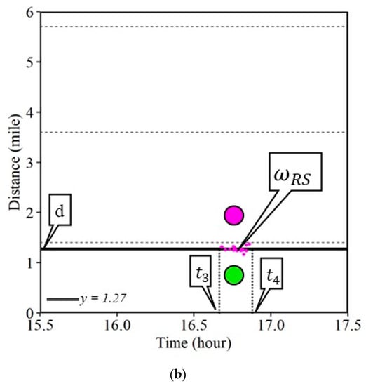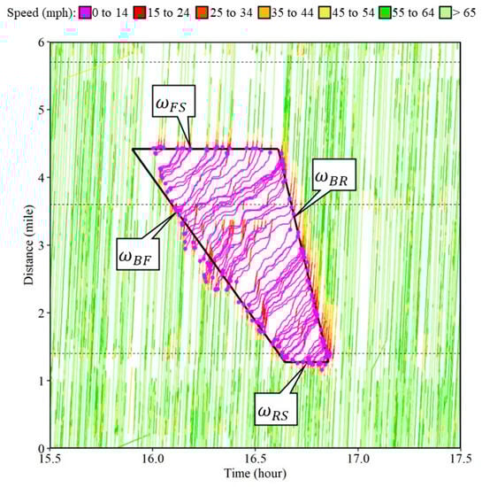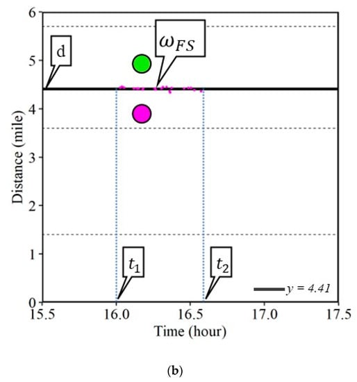 Individual waypoints from CV data with speeds below 15 mph are used for the identification of the bottleneck location, the formation of the shock wave, and the corresponding attributes of the shock waves. In the case of the frontal stationary shock wave, the latest waypoints with speeds below 15 mph before the incident clearance are chosen. When drivers turn their vehicles off, the key-off event creates separate short duration journeys within the queue, for the same vehicle, which are filtered. When information regarding the incident clearance is not available, a difference in the distance of more than 0.1 miles, i.e., the distance traveled by a vehicle travelling at 70 mph in 5 s, can be used as a limiting threshold. Twenty-two such waypoints were identified as shown by the pink dots in Figure 2b. The average of the distances of all such waypoints gives the location of the bottleneck (callout d), with the horizontal line denoting the frontal stationary shock wave () estimated at distance mark 4.41. The earliest and latest waypoints at this location would roughly provide the start (callout t1) and the end (callout t2) of the frontal stationary shock wave. The green circle and pink circle represent the uncongested and congested regions. The schematic presented in Figure 1 for the frontal stationary shock wave () closely matches the on-scene CV data in Figure 2b.