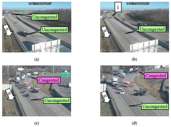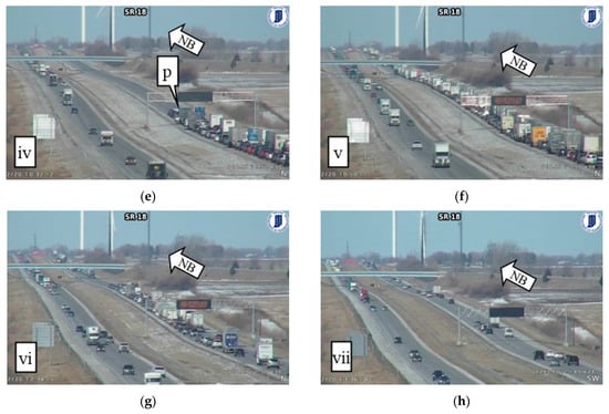 Camera images along the I-465 IL at the location highlighted by L1 in Figure 2a. (a) 3:50 PM; (b) 4:00 PM; (c) 4:08 PM; (d) 4:14 PM; (e) 4:36 PM; (f) 4:38 PM; (g) 4:44 PM; and (h) 4:46 PM.