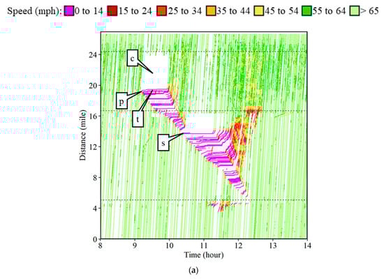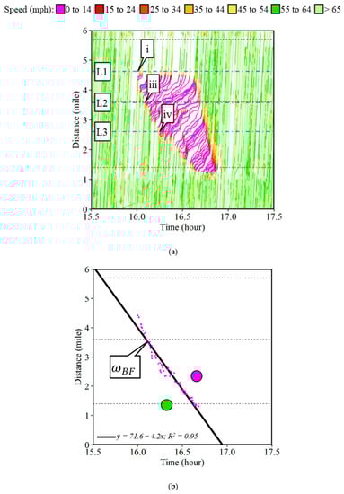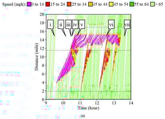where is the early recovery time in hours, is the time coordinate of the secondary crash incident, is the location coordinate of the secondary crash incident, is the intercept, and is the slope for the backward recovery shock wave as estimated in Figure 17b. The early recovery time (t) was estimated to be 8.79 min. If the engine fire incident had been cleared 9 min earlier, the secondary crash incident could have been prevented. Callout i denotes the potential recovery shock wave given the interstate was reopened 9 min earlier. Callout f points to the location of free flow conditions where downstream of that location traffic would not experience any congestion.