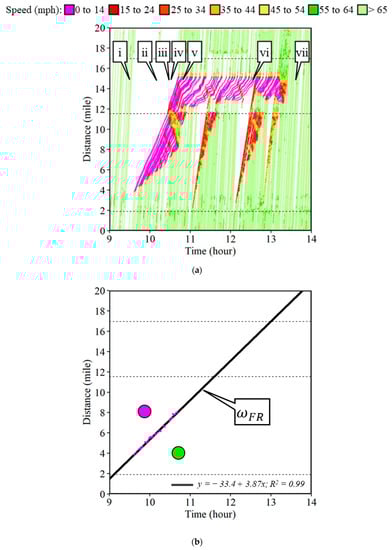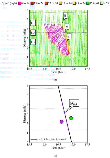The rolling slowdown example from the I-65 (Figure 12a) is also used for identifying the forward recovery shock wave. The first waypoints for the individual trajectories after the start of the rolling slowdown that have speeds below 15 mph are collected. Thirty-seven such waypoints for the first run were identified and are shown by pink dots in Figure 12b. A linear regression model fitted through these points had a slope of 3.87 mph (callout ) with an R2 value of 0.99. The congested region is formed between the forward forming and forward recovery shock waves.