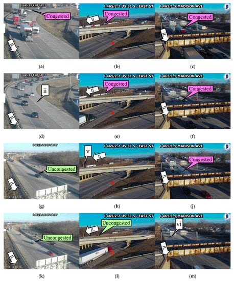 Camera images along the I-465 at the locations denoted by L1, L2, and L3 in Figure 4a. (a) L1 at 3:50 PM; (b) L2 at 3:50 PM; (c) L3 at 3:50 PM; (d) L1 at 4:00 PM; (e) L2 at 4:00 PM; (f) L3 at 4:00 PM; (g) L1 at 4:08 PM; (h) L2 at 4:08 PM; (j) L2 at 4:08 PM; (k) L1 at 4:14 PM; (l) L2 at 4:14 PM; and (m) L3 at 4:14 PM.
