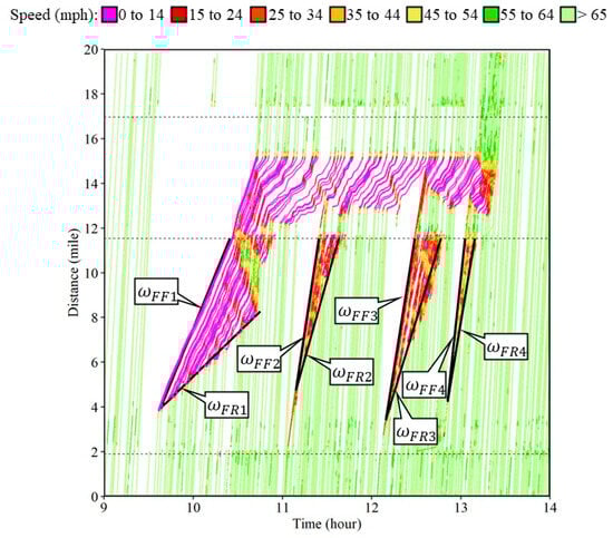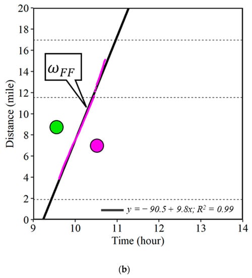 In case of a backward forming shock wave, the first waypoints with speeds below 15 mph are selected. Any waypoints that are not related to the backward forming queue are filtered. Eighty such waypoints were identified in this case shown by pink dots in Figure 4b. A linear regression model was fitted through these waypoints. The slope was estimated as negative 4.2 mph for the linearly regressed line with a coefficient of determination (R2) value of 0.95, showing a strong fit. The negative sign indicated that with time the shock wave is propagating upstream, opposite to the direction of traffic flow. For the backward forming shock wave, the congested region is on the right (denoted by the pink circle) and the uncongested region on the left (denoted by the green circle) in the time–space diagram. The propagation velocity for a backward forming shock wave of 4.2 mph means that every 1 hour of additional clearance time would increase the queue length by 4.2 miles. It is assumed that the backward forming shock wave has a constant speed. As the queue starts forming, the traffic tends to take alternate available routes and the traffic flow rate changes at the interstate exit locations. These exits are denoted by black horizontal dotted lines. It is important to note that, if a low R2 value is observed for the linear regression model, the identified waypoints can be divided at the interstate exits, and separate linear regression models can be fitted at each link to identify shock wave speeds downstream and upstream of such exit locations separately.