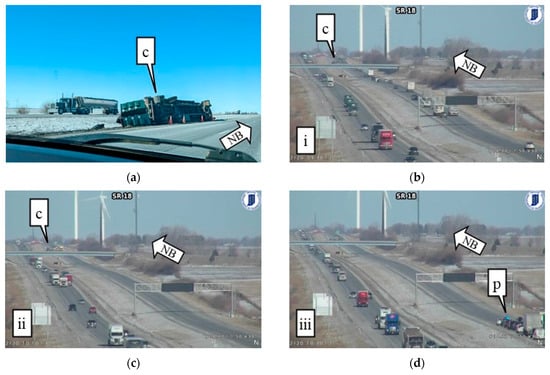 Figure 10a shows a rolling slowdown operation on the I-65 northbound (NB) direction in Indiana conducted on 20 February 2022. The operation was scheduled for clearing a truck that had rolled over during a winter storm two days prior (Figure 11a, callout c). A patrol vehicle started to slow vehicles down shortly after it entered the interstate at mile marker (MM) 178 to MM 188 shown by the two black dotted lines around distance 2 and 12, respectively, on Figure 10a. The patrol vehicle performed four rolling slowdown runs at various speeds. Figure 11b–h show camera images at different times of the day near the location of the rolled-over vehicle. Figure 11b (callout i) shows free flowing traffic when the rolled over vehicle (callout c) was still present and there were no interruptions to the traffic flow. The first run of the rolling slowdown operation started around 9:35 AM. Camera images at 10:10 AM (callout ii), 10:30 AM (callout iii), and 10:32 AM (callout iv), shown in Figure 11c–e, have no flowing traffic near the location of the incident. The response vehicles working at the incident location can be observed in these images near callout c. The patrol vehicle that was conducting the rolling slowdown operation and leading the slow moving vehicles was observed in camera images at 10:30 AM and 10:32 AM in Figure 11d,e (callout p). However, the traffic did have to slow down again as the clearance operation was not completed after the first two runs. Figure 11e shows a camera image at 12:34 PM when it was observed that a third run of the rolling slowdown was merging with the existing congestion caused at the incident location. Traffic flow was back to normal, as seen at 1:36 PM (Figure 11h), shortly after the completion of the fourth run of the rolling slowdown.