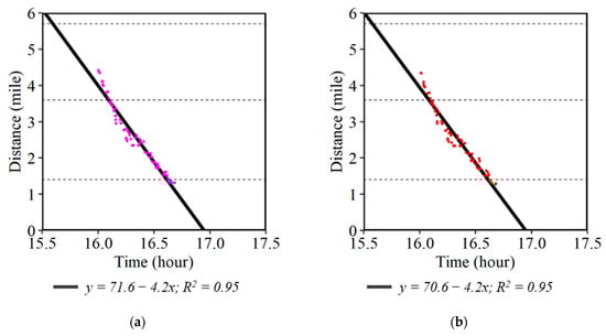 The patrol vehicle leading the rolling slowdown operation determines the speed of the forward forming shock wave. In this case, all the waypoints from the first leading trajectory are selected and shown by pink dots in Figure 10b. A linear regressed line is fitted through these points which has a slope of 9.8 mph with an R2 value of 0.99.