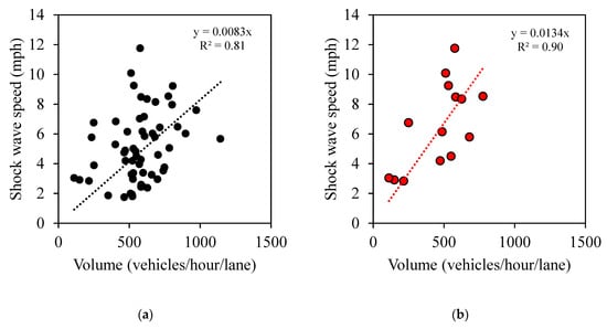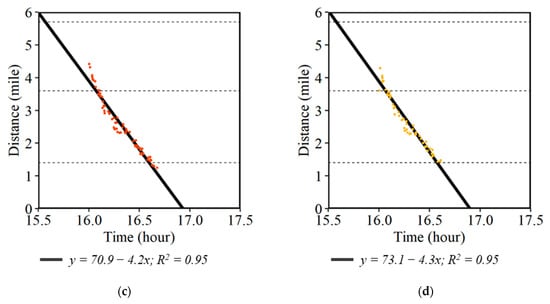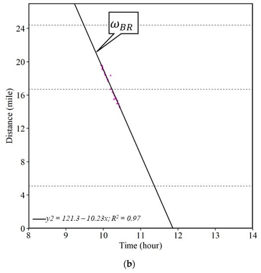 Figure 14 shows the estimation of backward forming shock wave speeds using four different speed boundary conditions for the same incident case shown in Figure 4. Using a speed threshold of 15 mph or below (Figure 14a), i.e., considering the first waypoints with speeds below this threshold at the upstream of the incident location, the estimated backward forming shock wave speed was found to be 4.2 mph. The same estimated backward forming shock wave speed using a 16–25 mph, 26–35 mph, and 36–45 mph thresholds was 4.2 mph, 4.2 mph and 4.3 mph, respectively. In all cases the R2 value was greater than 0.95. This indicated that the choice of speed boundary threshold did not have a significant impact on the estimated shock wave speed. However, the CV data are collected at a frequency of every 3 to 5 s. If a vehicle decelerates at more than 3.3 m/s2, the change in velocity will be more than 10 mph within the 3 s interval, and waypoints for the same vehicle might not be captured in a particular speed bin. Hence, the lowest speed threshold of 0 to 15 mph was used for selecting the boundary condition waypoints.