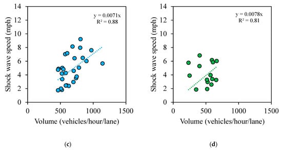 Estimation of the backward shock wave speed using different speed boundary thresholds. (a) 0–15 mph; (b) 16–25 mph; (c) 26–35 mph; and (d) 36–45 mph.