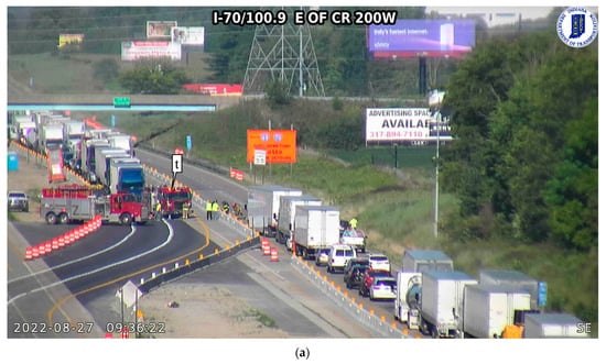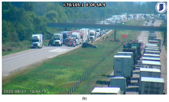 Figure 17a shows one such example of an engine fire (callout p) that caused shock waves along the I-70 on Saturday, 27 August 2022. The engine fire incident occurred around 9:08 AM and closed the eastbound interstate for about 48 min. Figure 18a shows the fire trucks responding at the incident location (callout t) with stopped traffic in both directions of travel. The interstate closure can also be observed from the white patch (callout c) with no trajectories downstream of the incident location after the engine fire broke out. A secondary crash occurred, as seen in Figure 18b, at the back of the queue around 10:15 AM, almost five miles upstream of the engine fire location (callout s). The interstate exits are denoted by black dotted lines in Figure 17. After the engine fire was completely extinguished and the incident was cleared, the interstate was opened back up around 9:56 AM starting the recovery shock wave. The backward recovery shock wave speed was estimated to be 10.23 mph (callout in Figure 17b), i.e., almost 1 mile of queue recovered every 6 min.