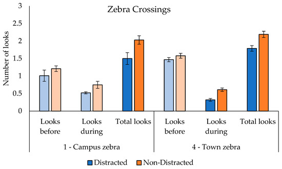 Mean number of looks made before, during, and in total for distracted and non-distracted pedestrians at zebra crossing sites. Error bars represent one standard error of the mean. Dark shaded bars indicate a statistically significant difference between distracted and non-distracted groups.