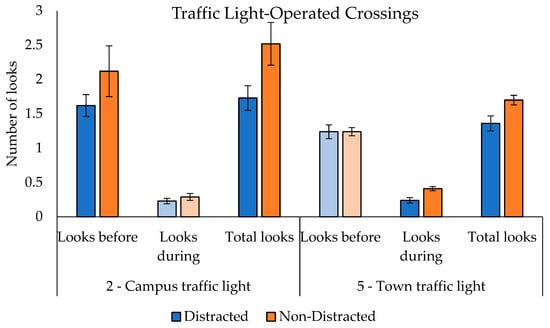Mean number of looks made before, during, and in total for distracted and non-distracted pedestrians at traffic light-controlled crossing sites. Error bars represent one standard error of the mean. Dark shaded bars indicate a statistically significant difference between distracted and non-distracted groups.
