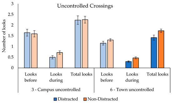 There was a statistically significant effect of distraction type on the total number of looks made before/during crossing at both controlled crossings (F(5, 395) = 5.42, p < 0.001, partial ƞ2 = 0.06) and uncontrolled crossings (F(5, 103) = 2.52, p = 0.03, partial ƞ2 = 0.11). The covariates of age and gender had no significant effect at either crossing type. Bonferroni post hoc tests revealed that the total number of looks was significantly higher when using headphones compared to talking to another pedestrian at controlled (p < 0.001) and uncontrolled crossings (p = 0.02).