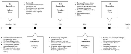 Certainly, the EDI system meant a revolution in the maritime port industry because, among other benefits, it led to the reduction of waiting times for goods in port stages (ship, terminals, and customs inspections) [], ship stopovers were optimized in terms of waiting time, and there was better coordination of inspections, improvement in the occupancy of terminals and depots, and a more efficient and safe administrative circuit. It was not until the 1990s that port facilities equipped with ICTs were found, which allowed a much more aggressive internationalization of ports. The fourth generation of ports in the 1990s was dominated by integrated port systems and characterized by the centralization of data and commercial synergies in the global containerized transport market (Figure 1).