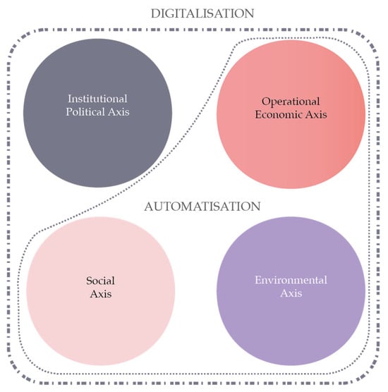 It is understandable that the four axes considered have an integral foundation within the three areas that make up sustainability (Society, Economy, and Environment). Although the digitalization pillar crosses the four defined axes, the automation pillar only includes those axes in which the procedures or operations are automatable, as defined in the following figure (Figure 2).
