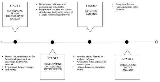 The purpose of this study is none other than to develop a system of indicators that allows measurement of the degree of digitalization of a list of dry ports in Spain, obtaining a ranking of the facilities and their degree of adaptation to an ideal concept of Smart Dry Port, “SDP”. This indicator is justified based on the four axes defined above and structured by the degree of its digitalization and automation. The methodology applied is defined in the following figure (Figure 3).