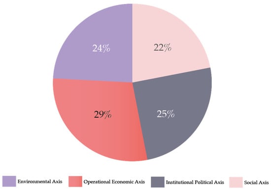 The fact that the operational economic axis has the highest importance (29%) suggests that operational and economic efficiency is a critical factor in the adaptation of dry ports to the Smart concept. This may imply that aspects such as process optimization, cost reduction, and efficiency improvement are being prioritized as key elements in becoming a Smart Dry Port.