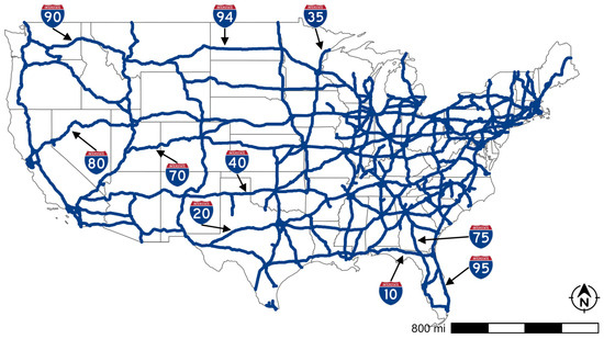 - Desai, J.; Mathew, J.; Li, H.; Sakhare, R.S.; Horton, D.; Bullock, D. National Mobility Analysis for All Interstate Routes in the United States: December 2022; Purdue University: West Lafayette, IN, USA, 2022. [Google Scholar] [CrossRef]