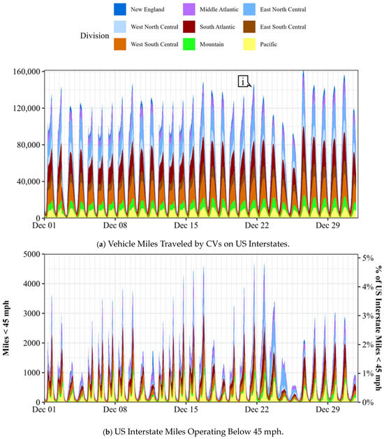Vehicle miles traveled (VMT) is a commonly used and well recognized measure for monitoring interstate travel trends. While VMT was traditionally documented by fixed traffic counters or recorders on major roadways, leaving room for potential underrepresentation of local traffic, ubiquitously available CV data allows for a more accurate estimation of VMT through continuous monitoring along an entire route as opposed to values recorded only at selected locations with detection equipment. Figure 2a shows a minute-by-minute visualization of VMT on the US Interstate System for the month of December 2022, colorized by nine geographic divisions made up of 48 US States and the District of Columbia. The U.S. Census Bureau [49] has defined these divisions and the corresponding component states as follows: New England (CT, ME, MA, NH, RI, VT), Middle Atlantic (NJ, NY, PA), East North Central (IN, IL, MI, OH, WI), West North Central (IA, KS, MN, MO, NE, ND, SD), South Atlantic (DE, DC, FL, GA, MD, NC, SC, VA, WV), East South Central (AL, KY, MS, TN), West South Central (AR, LA, OK, TX), Mountain (AZ, CO, ID, NM, MT, UT, NV, WY) and Pacific (AK, CA, HI, OR, WA). The states of Hawaii and Alaska were excluded from the Pacific division, as explained in the preceding text. Interstates in the state of Texas (West South Central) show the highest daily VMT. Notably, the substantial decline in VMT, beginning nominally around 21 December 2022 (callout i), aligned with the start of the major winter storm event.