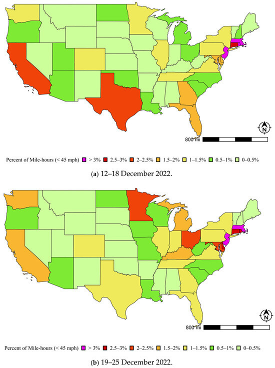 Week-over-week comparison of percent of major interstate route mile-hours operating below 45 mph by US State. (a) 12–18 December 2022. (b) 19–25 December 2022.