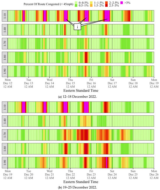 Minute-by-minute visualization of percent of total route operating below 45 mph for five longest US Interstates. (a) 12–18 December 2022. (b) 19–25 December 2022.