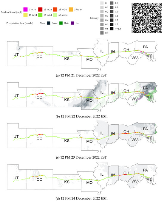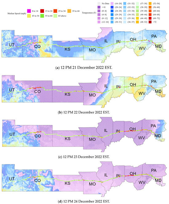 Recent studies have leveraged publicly available weather data from the National Oceanic and Atmospheric Administration (NOAA) to demonstrate the impact of precipitation, including rain intensity on interstate traffic speeds [52,53], predicting roadway visibility [54], forecasting road temperatures [55], and evaluating impacts of weather forecast accuracy on driver commutes [56], among others. Figure 5 and Figure 6 represent integrated visualizations using similar High-Resolution Rapid Refresh (HRRR) weather data (precipitation rate and temperature, respectively), as well as instantaneous median speeds recorded on every 0.1 mile section of I-70 for the ten US States it passes through. A snapshot of conditions is presented by the four subfigures as of noon Eastern Standard Time (EST) daily from 21–24 December to show the progression of the winter storm from west to east, as well as corresponding I-70 traffic conditions.