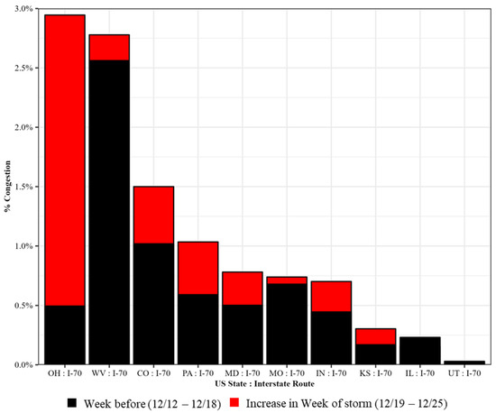 Normalized congestion indices provide an important tool to compare mobility impacts across routes of different lengths [50]. This study has used the congestion index concept to report the percentage of interstate mile-hours operating below 45 mph to quantify mobility on an interstate route. Figure 7 shows this percentage value for I-70, categorized and pareto sorted by each of the ten states it passes through. Values in black indicate the percentage value for the week of 12–18 December, while those in red indicate an increase, if any, in the week of 19–25 December. I-70 in Ohio clearly shows a significant jump from about 0.5% in the prior week, to about 3% during the week of the storm, roughly indicating a six-fold deterioration of interstate travel conditions. A speed threshold of 45 mph, as stated earlier, was utilized to define congested conditions.