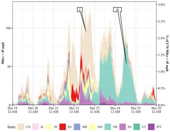 Figure 8 represents a subset of the national interstate mobility overview shown in Figure 2b by only focusing on miles of I-70 operating below 45 mph for the analysis period of 19–26 December 2022, colorized by each US State that I-70 passes through from Utah at its western end, to Maryland at its eastern end. This visualization effectively shows the order in which the winter storm progressed from state to state, with Colorado first seeing the highest impacts from the evening of 21 December to the late hours of 22 December (callout i), followed by Ohio from the early hours of 23 December through the late hours of 24 December (callout ii) as the storm moved eastward. As shown by the secondary axis to the right, at its peak, the winter storm impacted as much as 3% of the entire length of I-70 on the evening of 22 December.