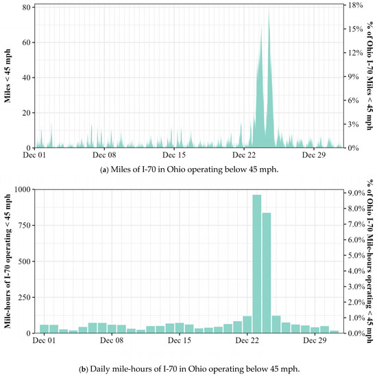 These system level visualizations were able to quantify the severity, duration and geographic impact during a 21–26 December winter storm. The analysis concludes by presenting a case study of interstate mobility for I-70 and the ten states it passes through, from Utah at its western end, to Maryland at its eastern end. At the storm’s peak, nearly 3% of the 4350 total directional route miles across ten states and nearly 18% of the directional route miles in the state of Ohio alone were found to be operating below 45 mph, thus highlighting the significant national and regional mobility challenges posed by this storm (Figure 8 and Figure 9a).