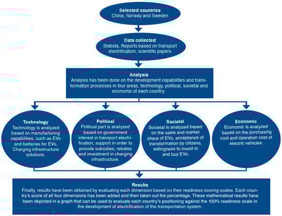 We have selected China, Norway, and Sweden as empirical grounds to explore their approaches to the electrification of transportation, analyze the different conditions and contextual aspects of importance for the electrification of transportation to identify major critical dimensions, and design the proposed multidimensional readiness index model. China has been chosen as it is currently the dominant and leading country in the electrification of transportation equipment and systems. Norway is one of the most electrified transportation countries globally, and Sweden is one country with ambitions to become one of the world’s leading countries in the electrification of transportation. The selected countries are characterized by their aspirations to diligently pursue the electrification of transportation and our explicit understanding of their development directions, although they might choose different paths. Figure 1 represents the research procedure followed in this paper to obtain results that show the readiness of China, Norway, and Sweden in transportation electrification.