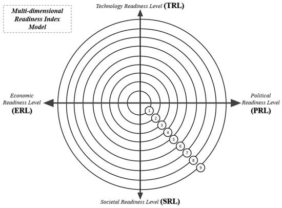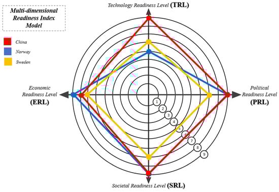 To evaluate the technology, political, societal, and economic readiness levels of each country, we have used TRL, PRL, SRL, and ERL scales. Each country is positioned in the multidimensional readiness index model based on the evaluation of the readiness scales, as shown in Figure 10.