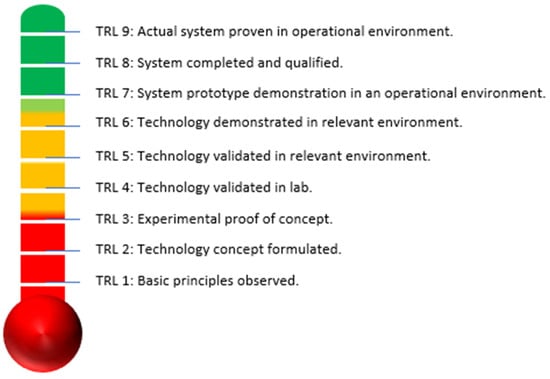 The technology readiness level (TRL) is an approach for conducting a logical analysis, assessment, and decision-making process when selecting an appropriate technological solution based on the maturity of technologies. The TRL has become a standard approach to measuring a particular technology’s maturity. Fundamentally, the TRL determines whether technologies are ready for adoption by potential consumers []. Level 1 is considered the lowest and level 9 is the highest for measuring the criterion on the TRL scale. Figure 3 demonstrates all nine TRLs [].