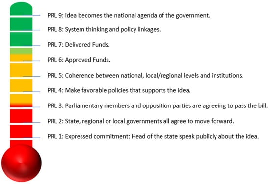 In our experience, technology has been one of the most critical driving forces of societal and industrial transformation. The advancement of technology has introduced various technological solutions for decarbonizing the environment, such as renewable energy, transportation electrification, hydrogen-based transportation, etc. However, large-scale R&D implementing new technical solutions and the diffusion of new technologies are almost impossible without political decisiveness and determination to utilize technology to transform and develop society. This is especially valid for the electrification of transportation as transportation is one of the most harmful environmentally impacting industrial sectors globally. At the same time, it is directly associated with the coal and oil industry, an economic engine and a significant employer of many countries that will lose out when the transportation system is electrified. Some suggest that this ongoing electrification of the European automotive industry might lead to about 500,000 people losing their current jobs []. Political readiness is seen when politicians recognize the problems and challenges and provide immediate support in framing new regulations, laws, and policies to support economies, industries, and consumers to be able to purchase expensive but desirable technologies that are costly in the beginning. Figure 4 explains the nine PRLs.