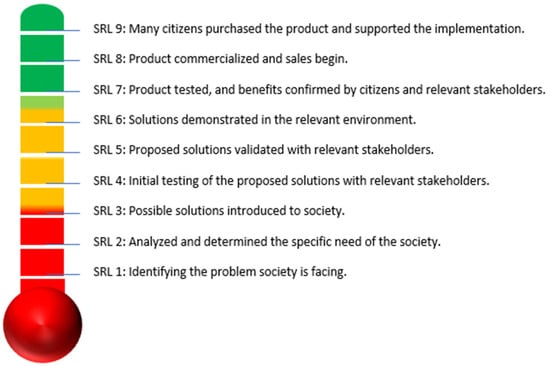 The societal readiness level is a scale for analyzing and evaluating the readiness level of societal acceptance; for example, a product or a technology to be integrated into society needs to be accepted and desired by its citizens. Suppose we continuously design technologies, infrastructure, and policies in which people are not incorporated and do not see the benefits for them and their lives. In that case, there will be a risk in moving towards electrified solutions because it could be a failure []. SRL 1 is the lowest and SRL 9 is the highest level of readiness, indicating that society has already started adopting new technologies or products. Figure 5 demonstrates all nine SRLs [].