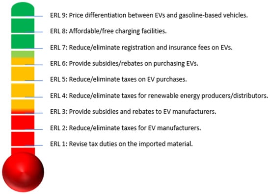 To develop the economic readiness levels, we focused on balancing the cost of three main factors (the manufacturing cost of EVs, energy supply for the transportation infrastructure, and operational cost), which governments can support by providing subsidies, rebates, and imposing/reducing taxes on EVs to push EVs in the market for societal diffusion to achieve certain benefits, for instance, decarbonizing the environment and relying less on fossil fuels. The government can support this until the economic readiness reaches the highest level where the price balances out for consumers and producers, which means that the consumers can afford the product, and the producers can still capture the value.