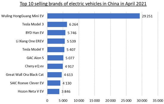 The electrification of transportation started in China 15–20 years ago. China is presently leading in developing electric vehicles, electric motors, batteries of all kinds, charging infrastructure, the essential component of EVs, and the software-based control and monitoring systems [,]. Different manufacturers introduced more than 200 brands of electric vehicles in China in 2020. Even though not all of those brands have manufacturing capabilities, they have outsourced a few large-scale electric vehicle manufacturers to design and use specific technology based on their required criteria []. In 2021, several Chinese EV manufacturers announced the export of EVs to Europe, focusing on the Scandinavian market. Of the top 10 brands of EV sold in China in April 2021, 9 of them are Chinese brands, except for Tesla, which is also manufactured in China, as stated in Figure 7 [].