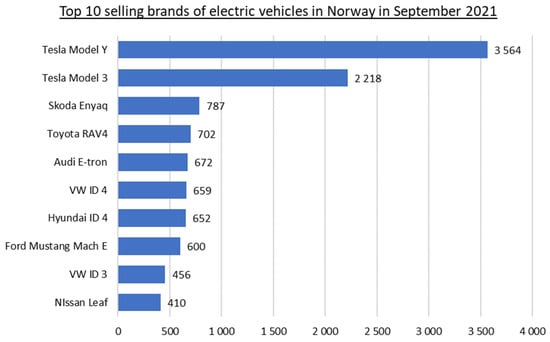 Norway does not produce electric vehicles but primarily imports them from other countries. The top 10 selling brands of electric vehicles in Norway in September 2021 were imported from the Czech Republic (Skoda), Germany (Volkswagen and Audi), Japan (Nissan and Toyota), South Korea (Hyundai), and the USA (Ford and Tesla), as shown in Figure 8 [].