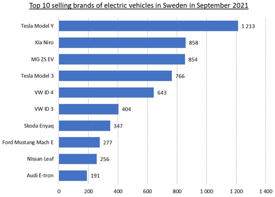 Sweden is an innovative industrial country. The Swedish automotive manufacturing company Volvo is now owned by the Chinese vehicle manufacturer Geely. In 2021, Volvo introduced two new EV brands, Volvo and Polestar, which are so far manufactured in China. However, the top 10 selling brands of electric vehicles in Sweden in September 2021 are imported from various countries, such as the Czech Republic (Skoda), Germany (Audi and Volkswagen), Japan (Nissan), South Korea (Kia), China (MG), and the USA (Ford and Tesla), as shown in Figure 9 [].