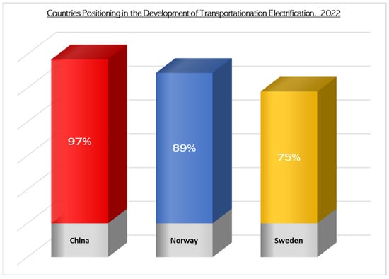 Table 5 shows that China scored 97%, followed by Norway and Sweden at 89% and 75%, respectively, in the development of transportation electrification. The calculations in Table 5 were used to plot a graph in Figure 11 to better visualize the positioning of the countries in transforming the transportation system.