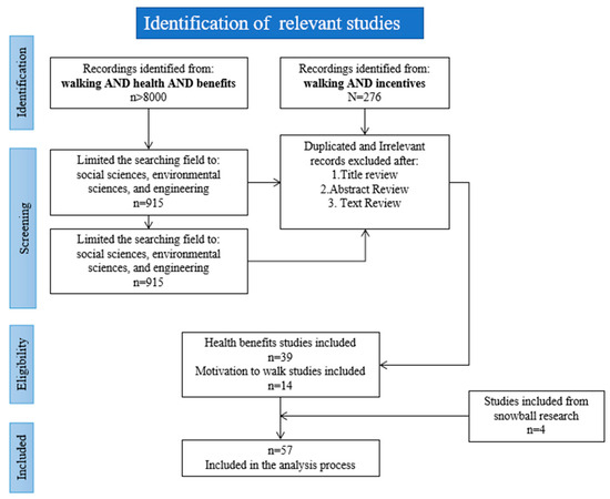 Following the review of primary studies, appropriate keywords accurately representing the research concepts were selected. These chosen keywords served as guides for subsequent database searches. An initial search using the terms “walking AND health AND benefits” was conducted in “Google Scholar”, “ScienceDirect”, “SPRINGER LINK”, “IEEE Xplore”, “Taylor and Francis”, “SAGE Publishing”, and “PubMed”, resulting in over 8000 results. The results were subsequently narrowed down to the fields of social sciences, environmental sciences, and engineering, resulting in 915 relevant studies. A subsequent search for “walking AND incentives” yielded 276 results.