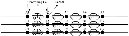 The specific construction process of a virtual track is as shown in Figure 1 and Figure 2 [69]. Any given lane of a section of a highway is divided into sections of 5–10 m long each. The specific value of the interval depends on the traffic characteristics in each region (the denser the traffic flow, the smaller the interval). Each of these intervals is called the “controlling cell”, and so the highway section is divided into several controlling cells. Each controlling cell is occupied by an autonomous vehicle (vehicles with a body length of more than 5 m–10 m can occupy two controlling cells), and at any given time, only one autonomous vehicle is allowed to occupy a controlling cell. In traditional railway control operation, each cell is either occupied or free. For the railway control logic to be followed, we could assume that one cell has to be free between two occupied ones. This may be something to consider in future versions of the work suggested here. The two ends of the controlling cell are marked as “virtual signal machines” (Nodes A1-C5), meaning that once a certain controlling cell is occupied by an autonomous vehicle, a message is transmitted, and the controlling cell is “closed”. This virtual signal machine information transmission is carried out through V2I interactive communication, which is a fundamental operation in the operation of a “virtual track” system.